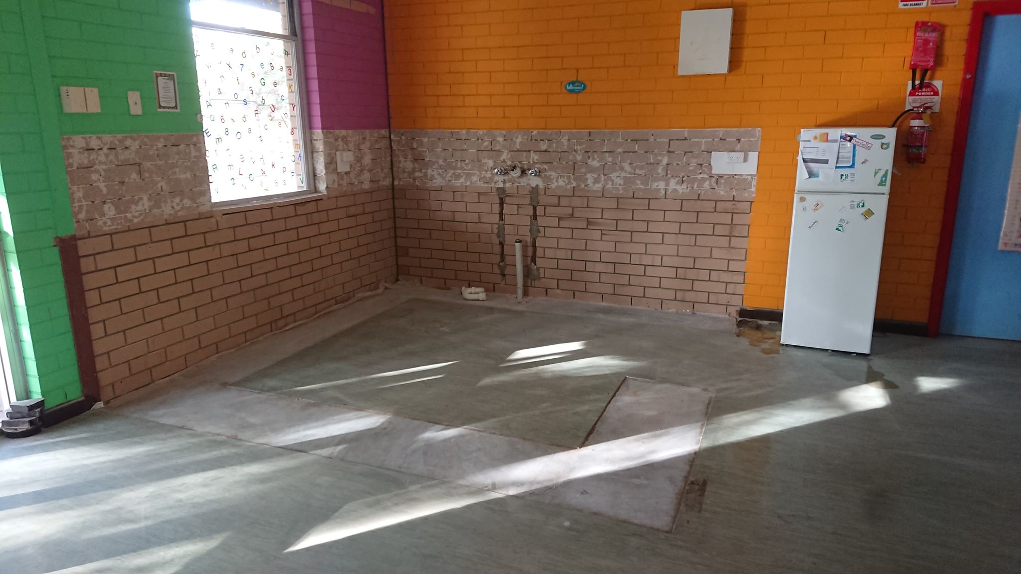 After fundraising enough for the kitchen to be replaced at our own cost, we found out upon the removal of the kitchen that the lino was damaged and needed to be replaced with a whole lot of dollars. Cue more grumpy faces.